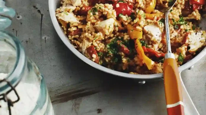 - Comida: Pollo con una gran porción de arroz integral y brócoli.